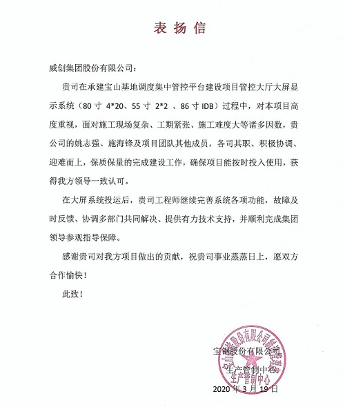 寶鋼股份有限公司生產(chǎn)管理管制中心給威創(chuàng)發(fā)來(lái)的表?yè)P(yáng)信