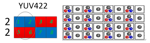 色度信號(hào)分辨率格式Y(jié)UV4:2:2,每4點(diǎn)Y采樣,就有相對(duì)應(yīng)的2點(diǎn)U和2點(diǎn)V??梢钥吹皆谒椒较蛏系纳缺硎具M(jìn)行了2倍下采樣,因此YUV422色度信號(hào)分辨率是亮度信號(hào)分辨率的一半。