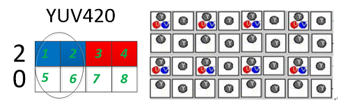 一種簡單的YUV420區(qū)分方法:如圖4所示,4個(gè)Y值,第1行獲得2組UV色度值(其中1、2合并為1組,3、4合并為1組),第2行獲得0組UV色度值(5-8像素的色度值全丟棄)。即在水平方向壓縮的基礎(chǔ)上,再在垂直方向上再進(jìn)行了壓縮。