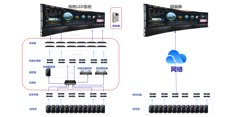 傳統(tǒng)LED系統(tǒng)的可靠性主要依賴于提高各個獨(dú)立設(shè)備的兼容性。由于擁有“顯控用”全系列產(chǎn)品的廠家極少,各廠家產(chǎn)品之間存在技術(shù)壁壘,產(chǎn)品的性能、可靠性和穩(wěn)定性等均存在差異,這樣形成的復(fù)雜系統(tǒng)“組裝機(jī)”,會導(dǎo)致整個系統(tǒng)發(fā)生故障機(jī)率增加。