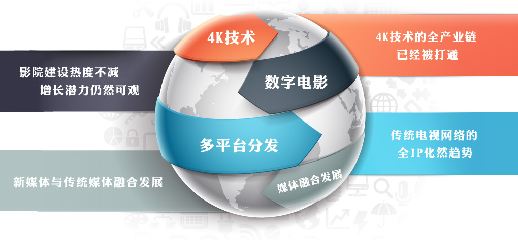 2014年廣電行業(yè)的核心 工作是強(qiáng)調(diào)以服務(wù)于廣播影視行業(yè)的發(fā)展需求為出發(fā)點(diǎn),在應(yīng)用先進(jìn)技術(shù),創(chuàng)新業(yè)務(wù)形式,不斷引領(lǐng)內(nèi)容創(chuàng)意以及提高內(nèi)容傳播能力和水平等方面描繪發(fā)展與趨勢(shì)。BIRTV 2014北京國際廣播電影電視展覽會(huì)于8月27日-30日在北京舉行,是中國廣播影視綜合展覽會(huì)之一,今年是第23屆。2014年廣電行業(yè)有 四大重點(diǎn):數(shù)字電影、4K技術(shù)、多平臺(tái)分發(fā)、媒體融合發(fā)展等方面。